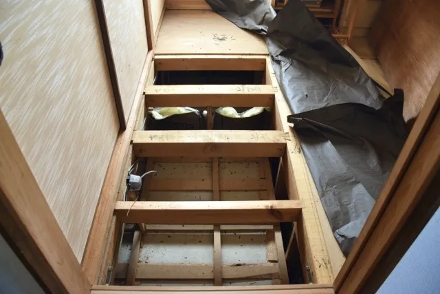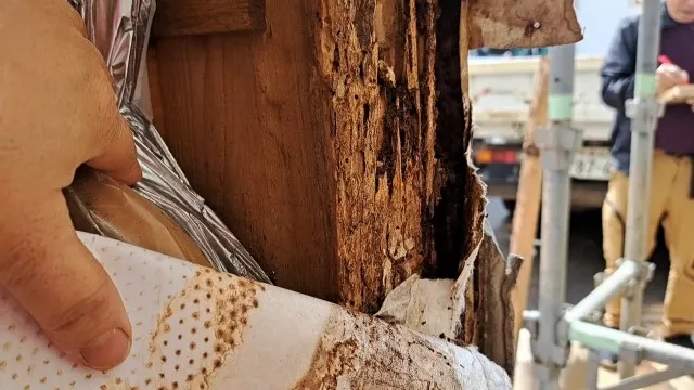 「シロアリっぽい虫を見かけたが、すぐ見なくなったので放置していた」というお客様。半年後、床が沈むような感覚が出始め、調査の結果、床下の大引きと根太がほぼ空洞状態に。すぐに駆除と大規模な補修工事が必要になりました。放置していた期間がたった数ヶ月でも、シロアリ被害はここまで広がってしまうことがあります。