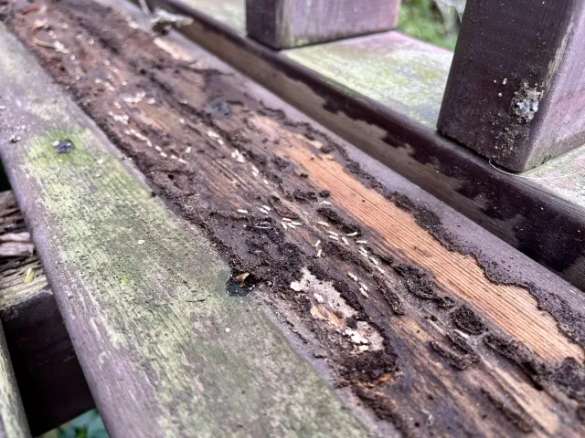 築15年の一軒家にお住まいのC様は、玄関のドア枠周辺に「わずかな浮き」を感じていたものの、特に気に留めていませんでした。しかし、雨が続いたある日、ドアがきちんと閉まらなくなり、調査を依頼。結果、玄関ポーチ下の構造材にシロアリの侵入と広範囲な食害が判明しました。床下だけでなく、外壁周りにも防蟻処理を施すこととなり、思わぬ修繕費が発生しました。