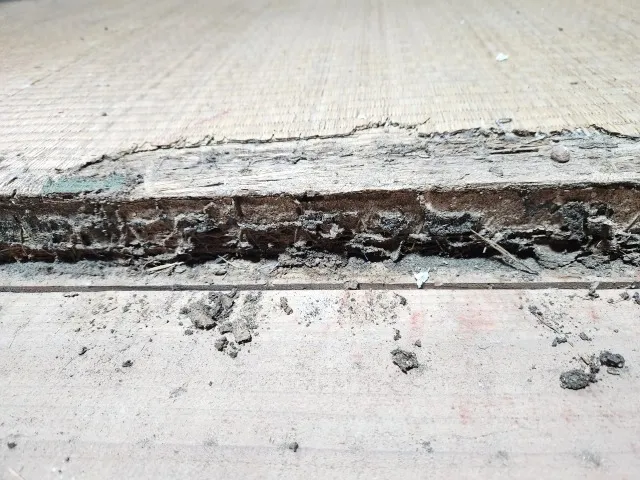 5年前に他社でシロアリ駆除をしたものの、その後点検もメンテナンスも行っていなかったというお宅。ある日、床がふわふわするとのことで調査を行うと、床下の大引(だいびき)や根太(ねだ)がシロアリに食われて空洞化していました。被害は想定以上に広がっており、床の全面張替えと構造補修が必要に。かなり高額の修繕費が掛かってしまいました。